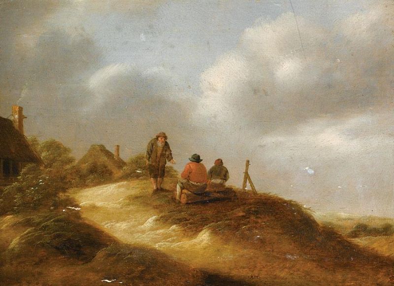 | A DUNE LANDSCAPE WITH THREE BOORS CONVERSING BEFORE A HAMLET | |