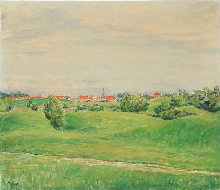 Green meadows with village in the background.