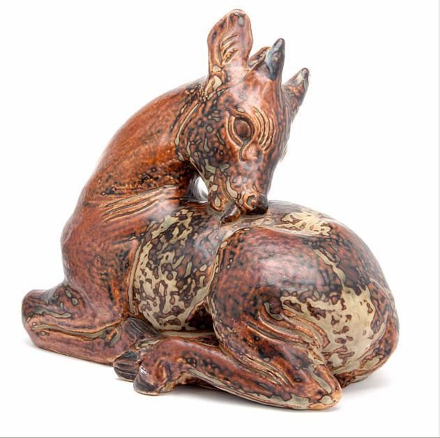 Stoneware figure modelled in the shape of a deer.