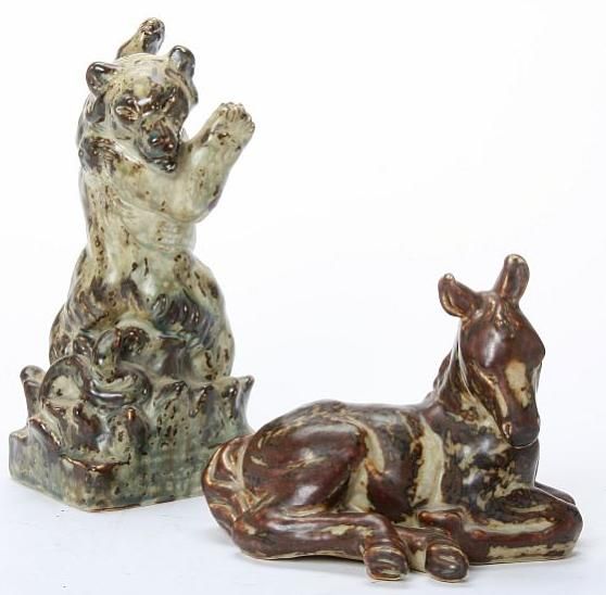 Two figures of stoneware in the shape of a bear and a foal