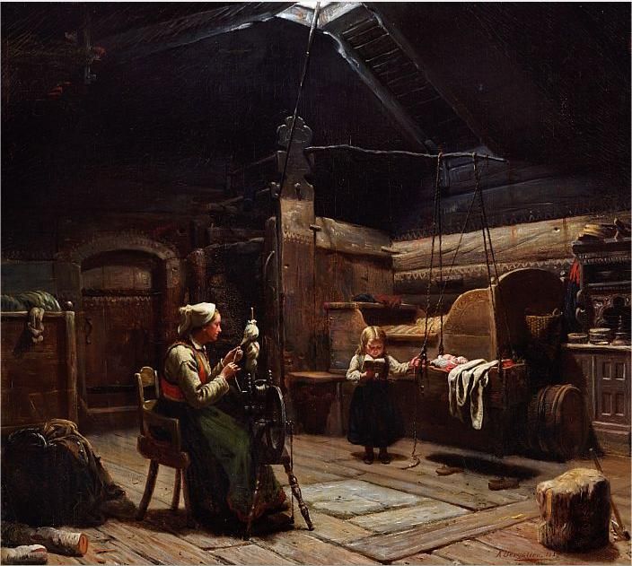| Interior from a Norwegian hut with a mother at the spinning wheel and a girl rocking her little brother | |