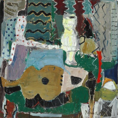 Cubist still life with guitar. Signed Knud N. 48. Oil on plywood. 82×82 cm. | |