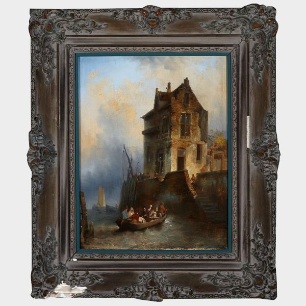 PASSENGERS IN BOATS ARRIVING AT A TOWN PIER