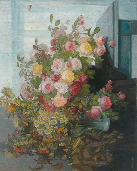 | Still Life with roses and meadow flowers on a table | |