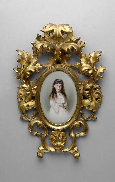 | A child holding a sprig of apricot roses, her long hair held by a blue band and wearing a white dress, with gold cross on a blue | |