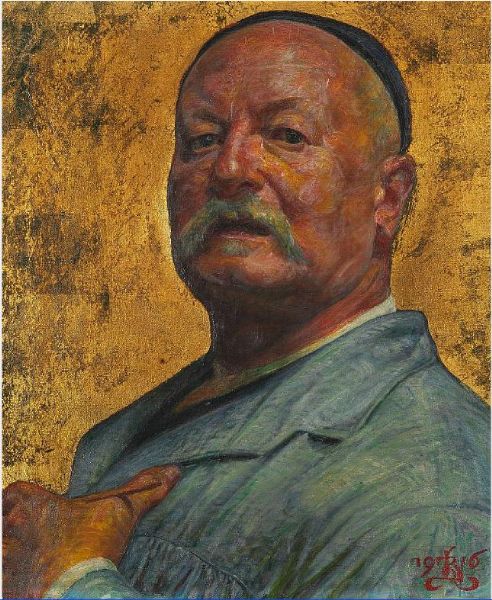 | Self-portrait with ice-blue smock and black skullcap. | |