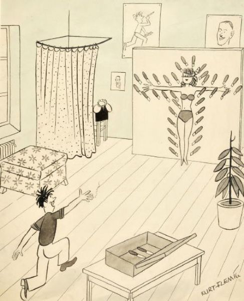 Der Messerwerfer wirft auf eine Frau, deren Augen verbunden sind