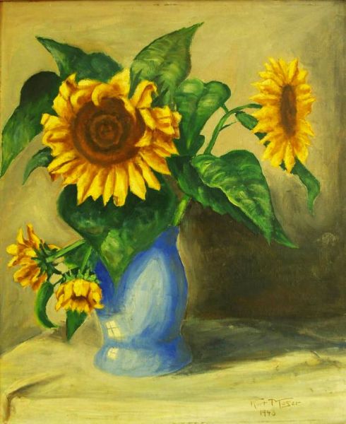 Stilleben Sonnenblumen in blauer Vase.