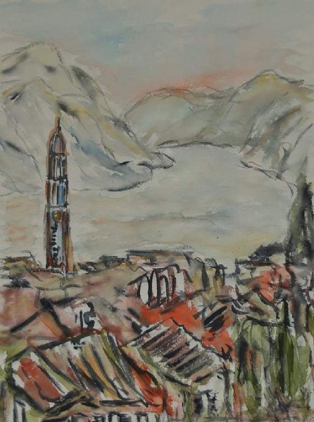 Blick auf die Dächer von Ascona mit Dorfkirche und dem Gebirgsmassiv