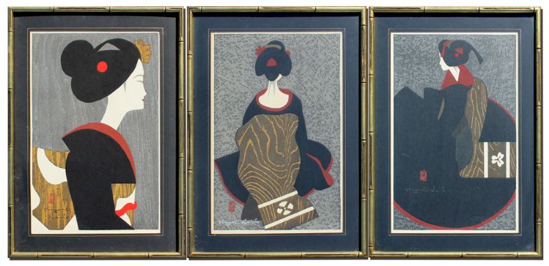 Three Piece Japanese Woodblock Print Lot Of Geishas