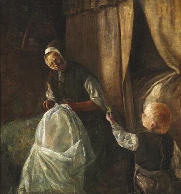 A boy passes a green pea to his grandmother. She is sewing