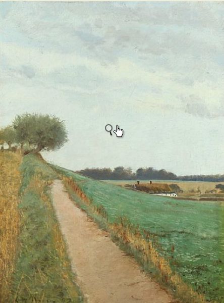 Bakket landskab med bondegård i baggrunden
