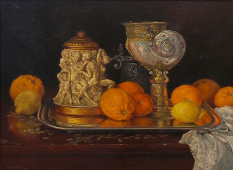 Zátiší s pomeranči, renesančním pohárem a korbelem