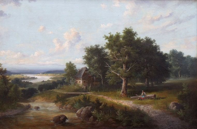 Weite Landschaft mit Wassermühle und Personenstaffage