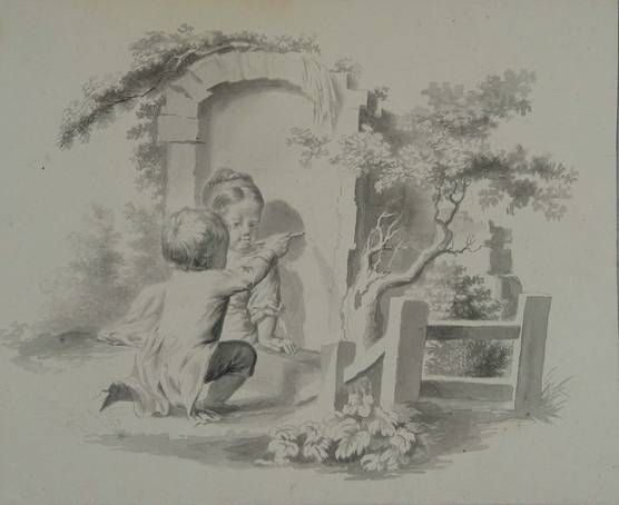 | A little boy painting the silhouette of a little girl by tracing the shadow of her face on a wall in a garden | |