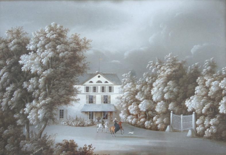 RIDERS WITH A DOG IN THE GROUNDS OF A COUNTRY HOUSE; A HORSEMAN AND FIGURES NEAR A COUNTRY HOUSE