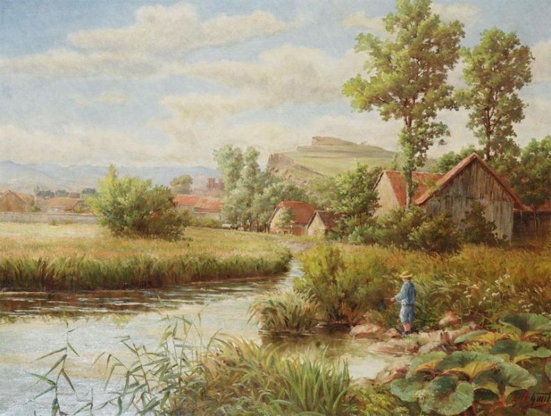 Hilly German landscape with fisherman near a brook.