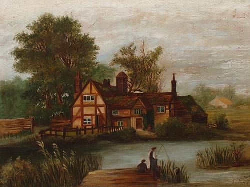 Figures fishing on a small pier before a country cottage; Fishing before a farm