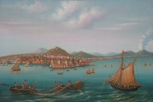 View of the Bay of Naples and Vesuvius erupting viewed from a terrace