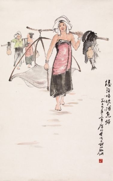 Fischerin mit Netz an einer Tragestange bei der Heimkehr.