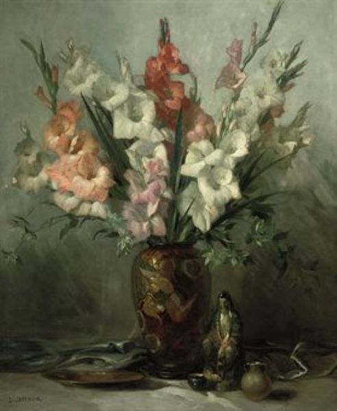 | Gladioli in an Oriental vase with ornaments on a draped table | |