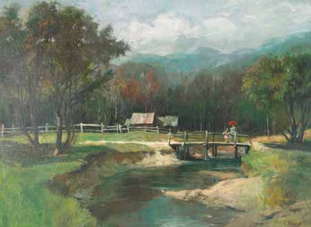 MOTHER AND CHILD ON A BRIDGE IN A MOUNTAIN LANDSCAPE