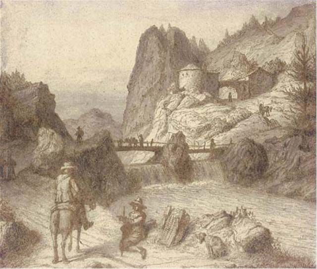 | A mountainous landscape with a traveller on horseback conversing with a man seated by a river | |