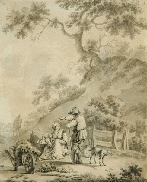 Landschap met werkende boer en boerin