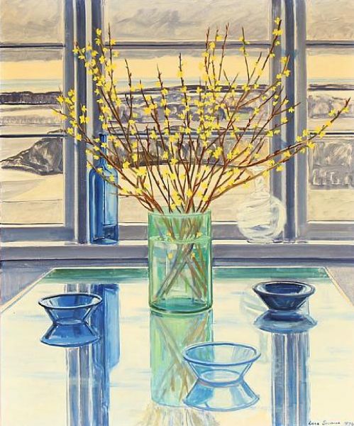 Vase with forsythia in front of a window