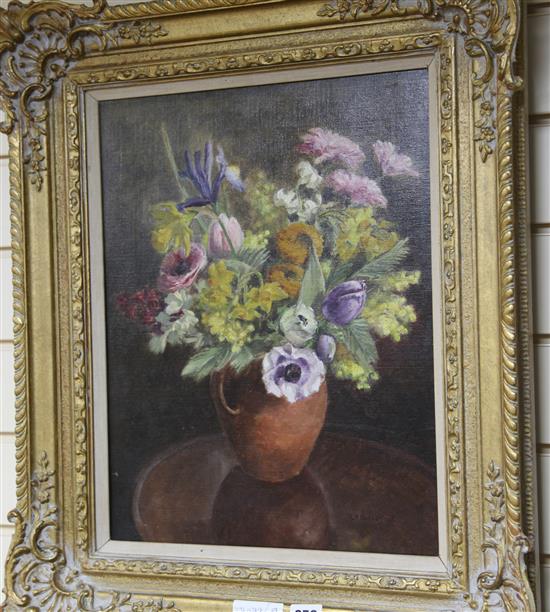 Still life of mixed flowers in a terracotta vase