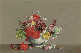 | Pansy, Scarlet Geraniums, Geranium leaves, Anthemis, Yellow flowers and aurelia | |