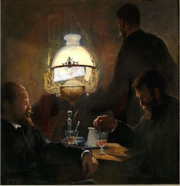 | Interior from a café in lamplight with painter Chr. Clausen to the right and chief of section Erik Reinhardt to the left | |