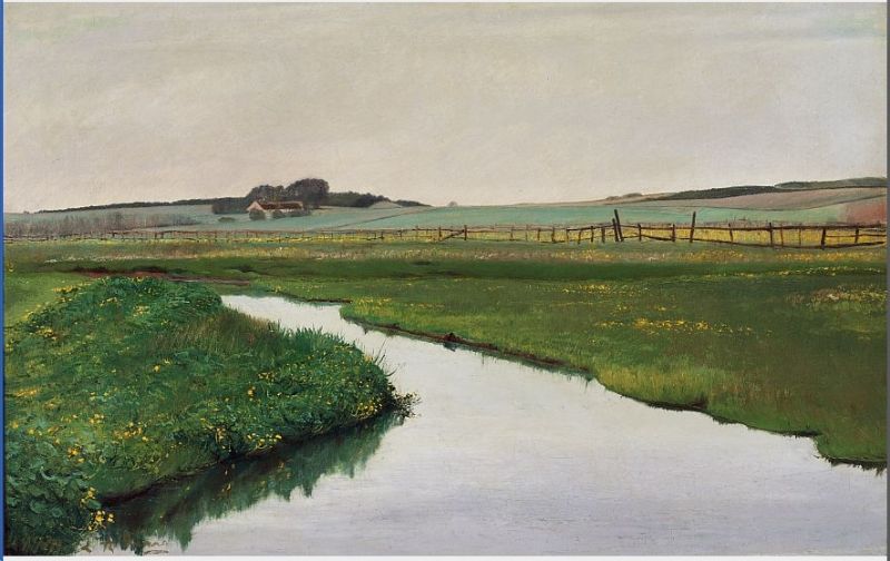 | Stream through green fields with marsh marigold (Kabbeleje) in bloom. | |