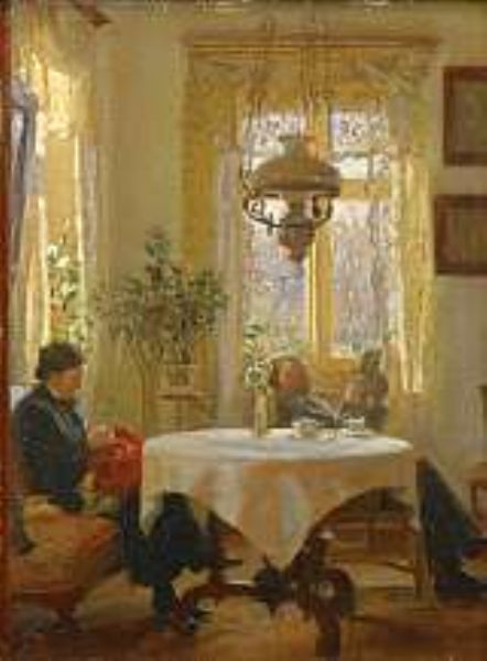| Solsken i rummet, interiör med handarbetande kvinna och läsande man | |