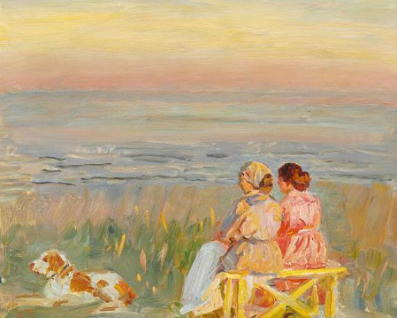 | Two seated women and a dog at sunset in Skagen. Presumably the artist's wife and daughter | |