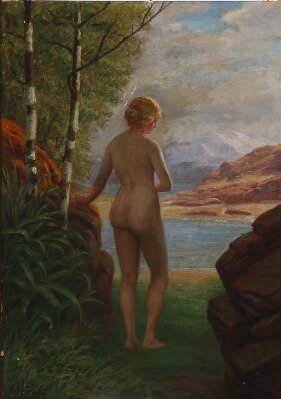 A female nude standing at the lakeside