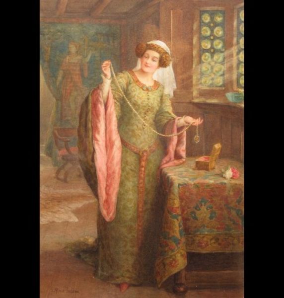 portrait of a pre-raphaelite lady admiring jewellery stood beside a window