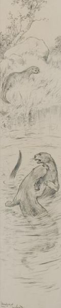 | Study of three otters, two fighting in the water in the foreground another on the far bank | |