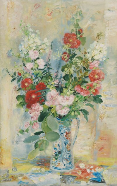 signed 'Le pho', signed again in Chinese (lower left); titled 'Les roses Trémières' (on the reverse)