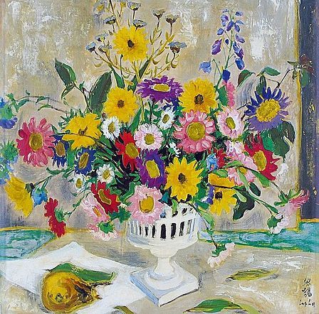 NATURE MORTE AU BOUQUET DE FLEURS ET A LA POIRE