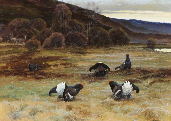 | Black grouse and roe deer in a hilly landscape at dusk | |