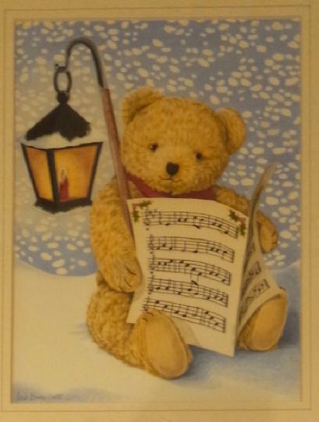 A Christmas teddybear and another with a snowman