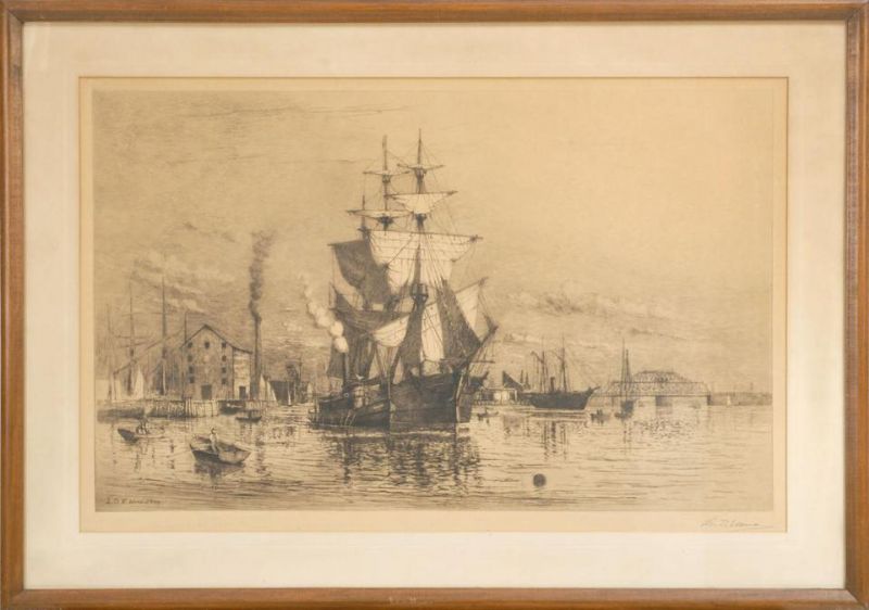 A whaleship leaving dock in New Bedford Harbor with a tug alongside