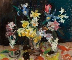 STILL LIFE WITH DAFFODILS, IRIS, RHODODENDRON, TULIPS AND LILAC JUG