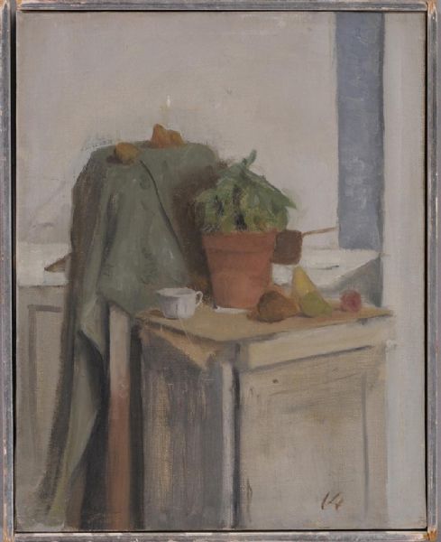 STILL LIFE WITH FRUIT, POTTED PLANT AND MUG