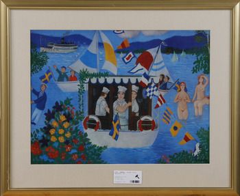 | Kompostion med bl a signalställ, båtar, badande kvinnor samt kockar | |