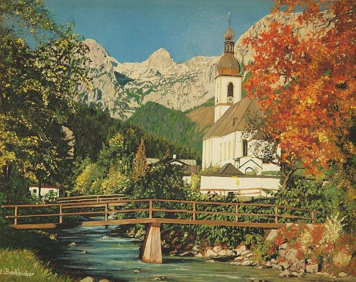 Ramsauer Ache mit Pfarrkirche St. Sebastian vom Malerwinkel aus