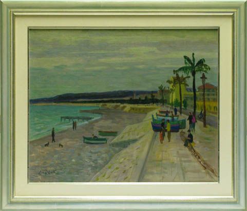 | Frühsommerliche Partie in Nizza. Blick auf Strand und Quai des Anglais mit Figurenstaffage | |