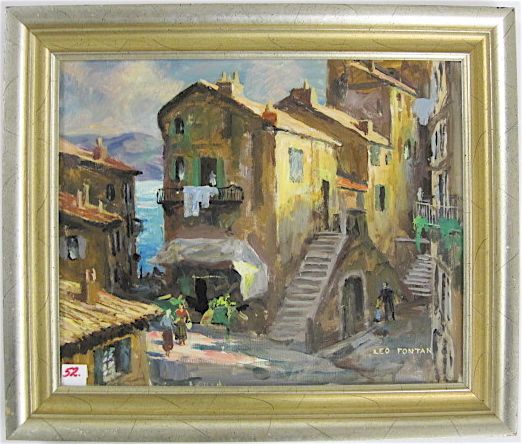 Village scene with pedestrians, wash hanging from balcony, everyday life