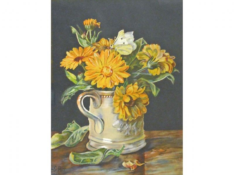 still life of chrysanthemums and a perched butterfly within a ceramic tankard